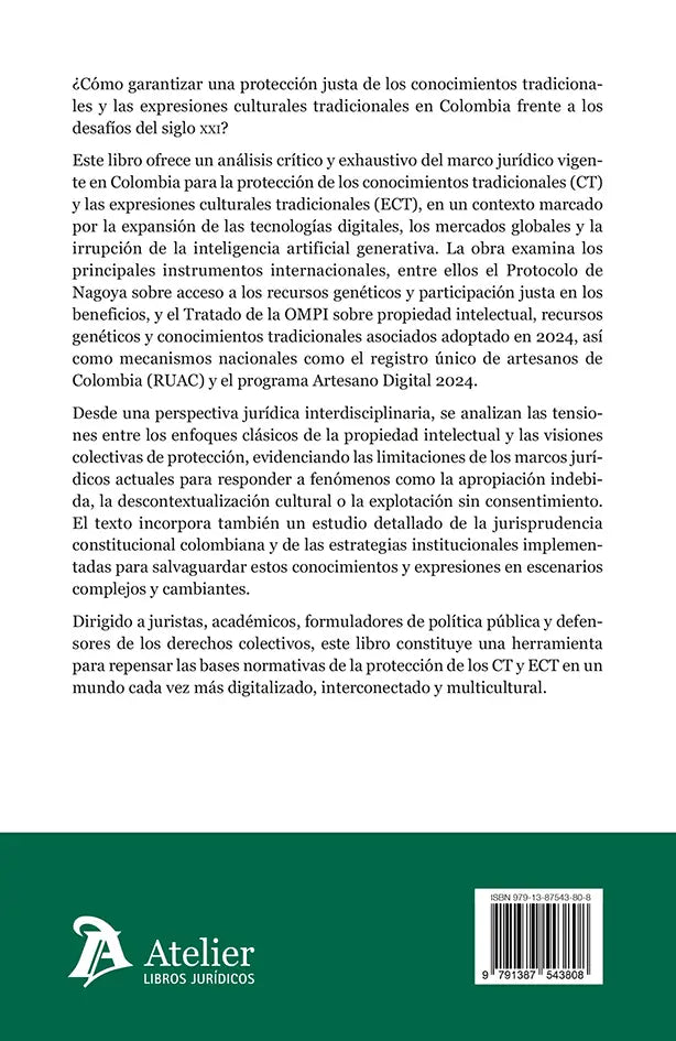 ¿Cómo proteger de forma justa los conocimientos tradicionales (CT) y las expresiones culturales tradicionales (ECT) en un mundo atravesado por la digitalización, la globalización de los mercados y el auge de la inteligencia artificial? Este libro ofrece una respuesta crítica y fundamentada a ese desafío, mediante un análisis exhaustivo del marco jurídico colombiano vigente y su interacción con los instrumentos internacionales más relevantes, como el Protocolo de Nagoya y el reciente Tratado de la OMPI sobre propiedad intelectual, recursos genéticos y conocimientos tradicionales adoptado en 2024.