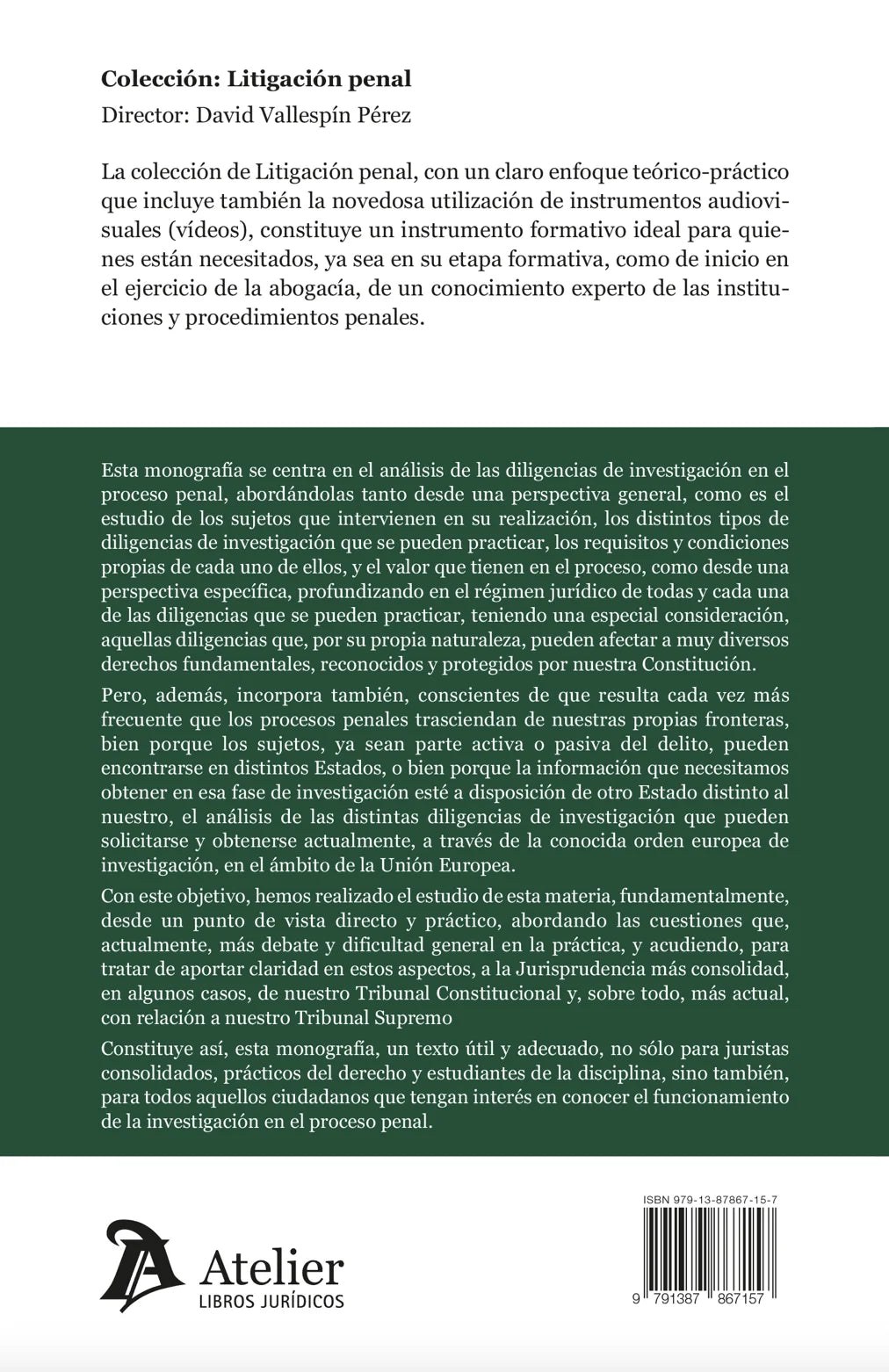 Esta monografía ofrece un estudio integral y actualizado sobre las diligencias de investigación en el proceso penal, abordando tanto su dimensión general como su tratamiento específico. A lo largo de sus capítulos, se analiza el papel de los distintos sujetos que intervienen en su práctica, la tipología de diligencias existentes, los requisitos legales que las condicionan y el valor probatorio que revisten dentro del procedimiento. Especial atención se dedica a aquellas diligencias que, por su naturaleza intrusiva, pueden incidir en derechos fundamentales reconocidos por la Constitución, exigiendo un análisis particularmente riguroso de su régimen jurídico.