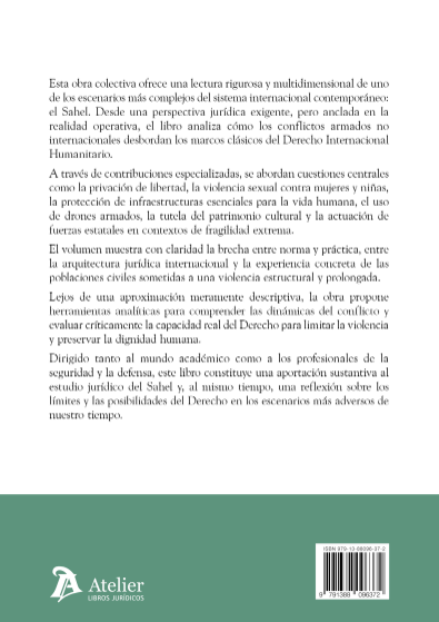 Esta obra colectiva ofrece una lectura rigurosa y multidimensional de uno de los escenarios más complejos del sistema internacional contemporáneo: el Sahel. Desde una perspectiva jurídica exigente, pero anclada en la realidad operativa, el libro analiza cómo los conflictos armados no internacionales desbordan los marcos clásicos del Derecho Internacional Humanitario. A través de contribuciones especializadas, se abordan cuestiones centrales como la privación de libertad, la violencia sexual contra mujeres y niñas, la protección de infraestructuras esenciales para la vida humana, el uso de drones armados, la tutela del patrimonio cultural y la actuación de fuerzas estatales en contextos de fragilidad extrema. El volumen muestra con claridad la brecha entre norma y práctica, entre la arquitectura jurídica internacional y la experiencia concreta de las poblaciones civiles sometidas a una violencia estructural y prolongada. Lejos de una aproximación meramente descriptiva, la obra propone herramientas analíticas para comprender las dinámicas del conflicto y evaluar críticamente la capacidad real del Derecho para limitar la violencia y preservar la dignidad humana. Dirigido tanto al mundo académico como a los profesionales de la seguridad y la defensa, este libro constituye una aportación sustantiva al estudio jurídico del Sahel y, al mismo tiempo, una reflexión sobre los límites y las posibilidades del Derecho en los escenarios más adversos de nuestro tiempo.