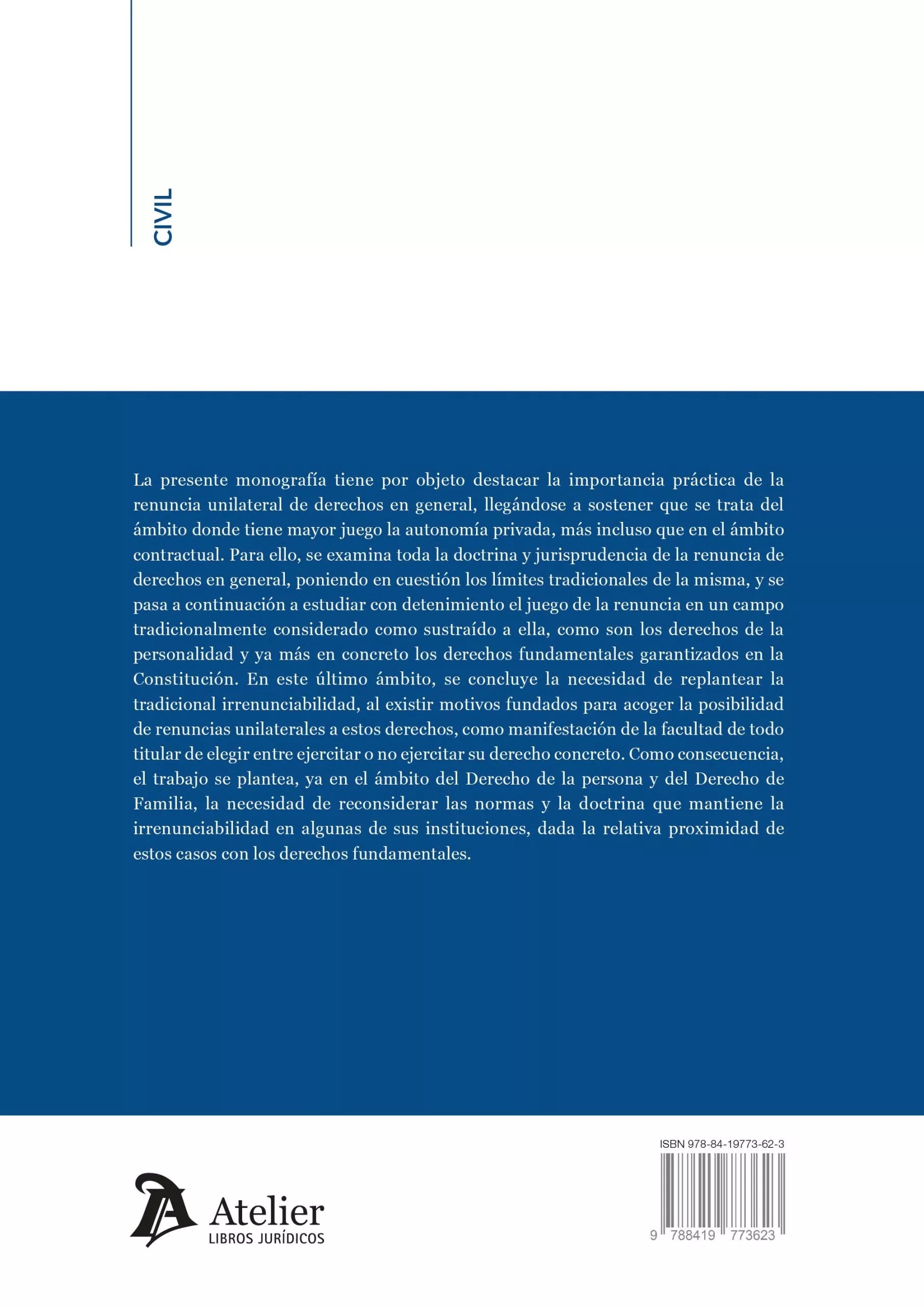 Especial atención merece la posibilidad de renunciar a derechos de la personalidad y derechos fundamentales, tradicionalmente considerados irrenunciables. Desde un enfoque crítico y bien argumentado, se plantea la necesidad de replantear esta premisa, especialmente cuando el titular, en pleno ejercicio de su libertad, opta por no ejercitar determinados derechos. Esta reflexión se proyecta también sobre instituciones del Derecho de la Persona y del Derecho de Familia, donde las normas vigentes podrían requerir una revisión profunda.