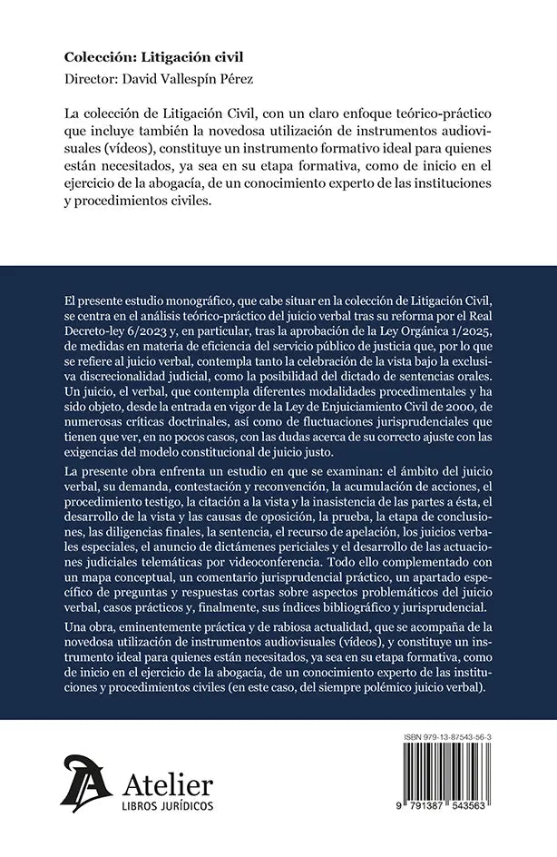 Con un estilo claro y orientado a la aplicación profesional, la obra se dirige tanto a quienes se encuentran en proceso de formación como a quienes se inician en el ejercicio de la abogacía, ofreciendo no solo una guía experta sobre el juicio verbal, sino también una innovadora propuesta metodológica que incluye recursos audiovisuales. Una obra imprescindible para afrontar con solvencia uno de los procedimientos más relevantes —y debatidos— del proceso civil español.