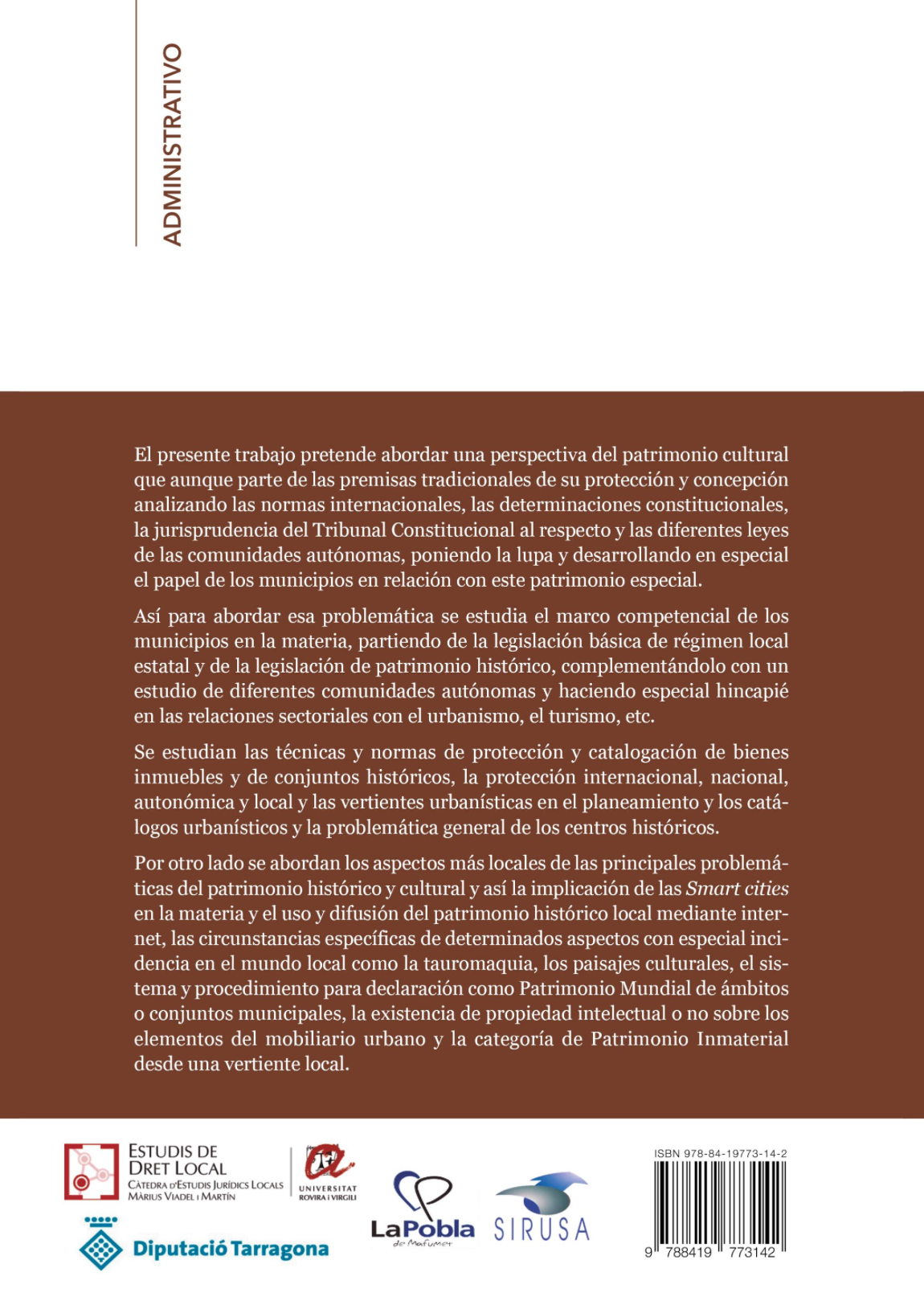 Aquesta perspectiva municipal permet abordar qüestions emergents com la digitalització del patrimoni, el rol de les smart cities, els paisatges culturals, la tauromàquia, el patrimoni immaterial o el procediment per a la declaració de Patrimoni Mundial en àmbits locals. També es tracta la possible existència de drets de propietat intel·lectual sobre elements del mobiliari urbà, aportant una visió completa i articulada sobre les múltiples dimensions del patrimoni cultural en l’àmbit local i les seves implicacions pràctiques i jurídiques.
