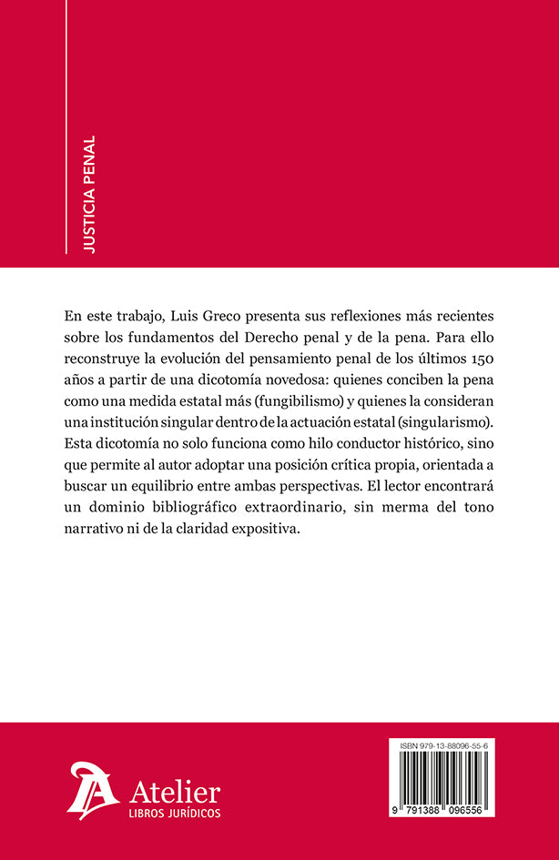 Este trabajo recoge las reflexiones más recientes de Luis Greco sobre los fundamentos del Derecho penal y la justificación de la pena. A través de una innovadora dicotomía —entre el fungibilismo, que concibe la pena como una medida estatal más, y el singularismo, que la interpreta como una institución excepcional dentro del aparato estatal—, el autor traza una genealogía crítica del pensamiento penal de los últimos 150 años.