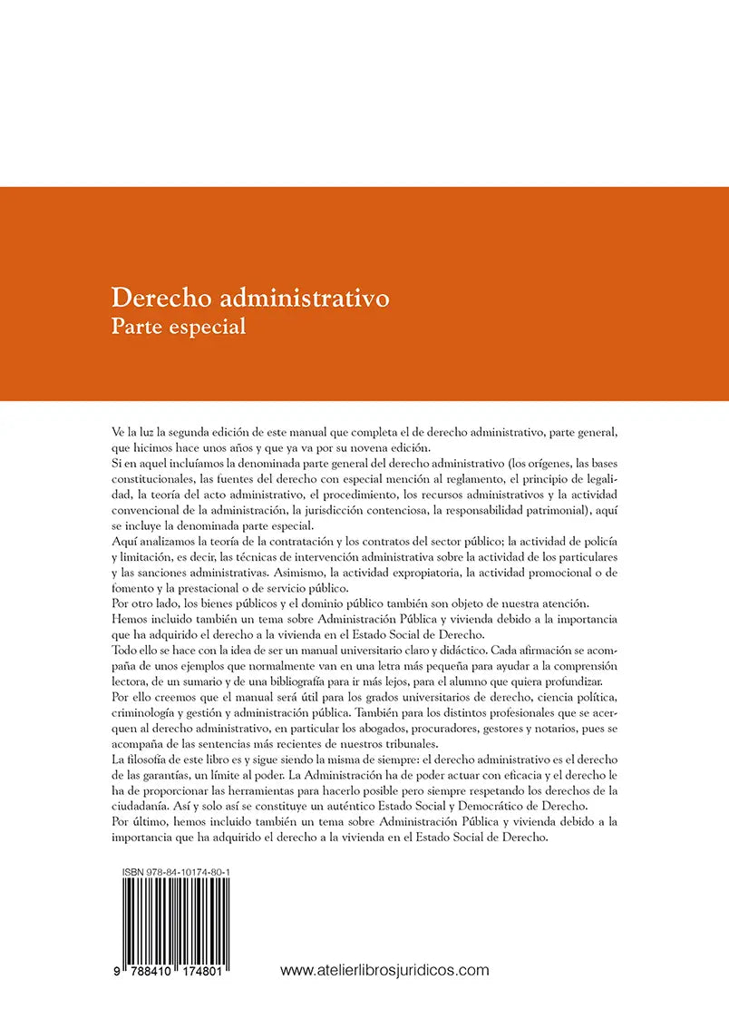 Ve la luz la segunda edición de este manual que completa el de derecho administrativo, parte general, que hicimos hace unos años y que ya va por su novena edición.Si en aquel incluíamos la denominada parte general del derecho administrativo (los orígenes, las bases constitucionales, las fuentes del derecho con especial mención al reglamento, el principio de legalidad, la teoría del acto administrativo, el procedimiento, los recursos administrativos y la actividad convencional de la administración, la jurisdicción contenciosa, la responsabilidad patrimonial), aquí se incluye la denominada parte especial.Aquí analizamos la teoría de la contratación y los contratos del sector público; la actividad de policía y limitación, es decir, las técnicas de intervención administrativa sobre la actividad de los particulares y las sanciones administrativas. Asimismo, la actividad expropiatoria, la actividad promocional o de fomento y la prestacional o de servicio público.