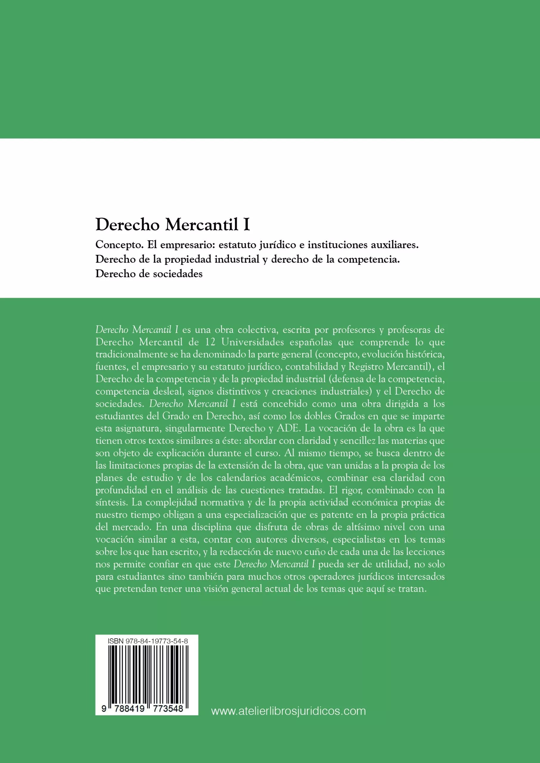 Derecho Mercantil I es una obra colectiva, escrita por profesores y profesoras de Derecho Mercantil de 12 Universidades españolas que comprende lo que tradicionalmente se ha denominado la parte general (concepto, evolución histórica, fuentes, el empresario y su estatuto jurídico, contabilidad y Registro Mercantil), el Derecho de la competencia y de la propiedad industrial (defensa de la competencia, competencia desleal, signos distintivos y creaciones industriales) y el Derecho de sociedades.
