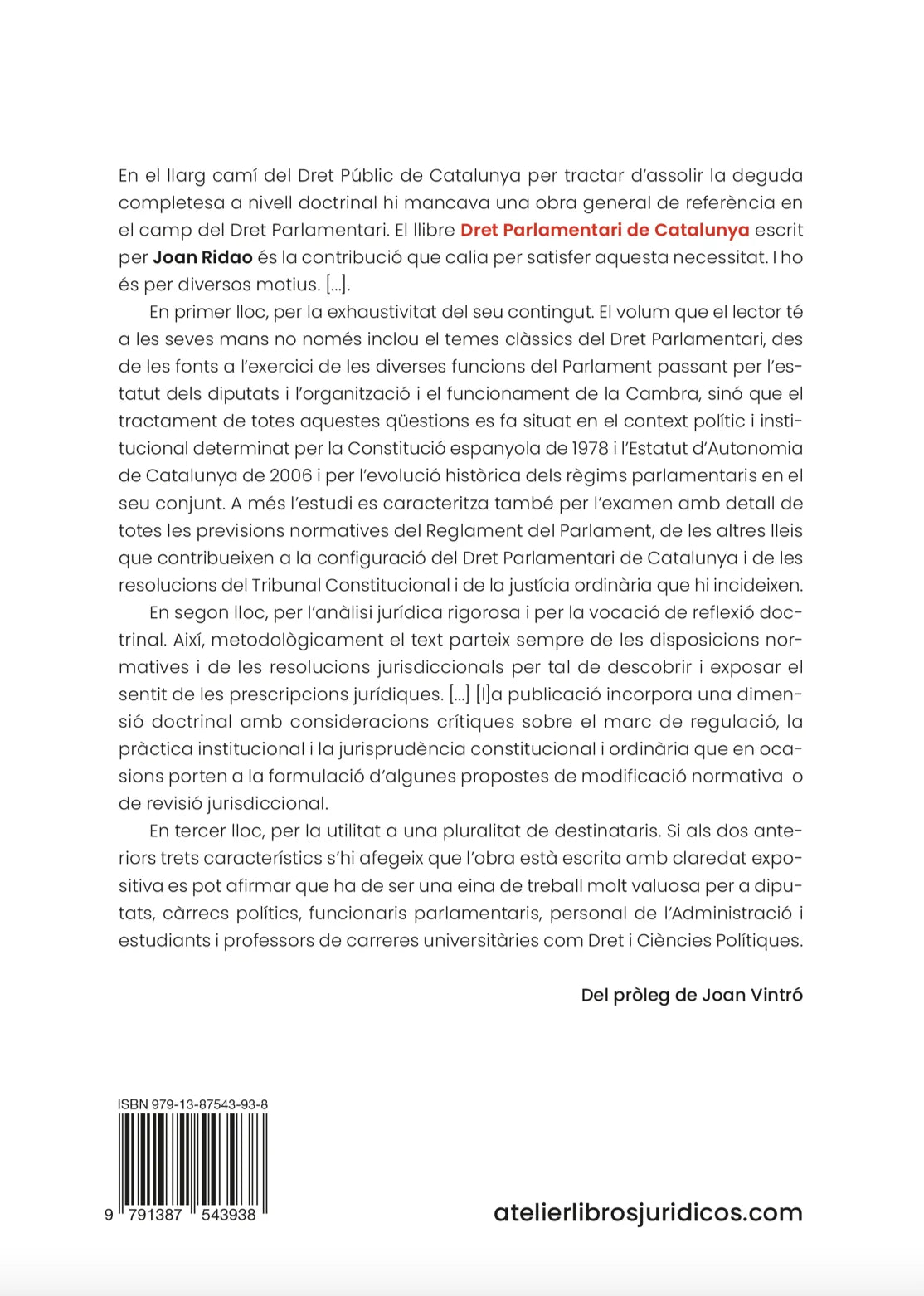 I ho és per diversos motius. […].En primer lloc, per la exhaustivitat del seu contingut. El volum que el lector té a les seves mans no només inclou el temes clàssics del Dret Parlamentari, des de les fonts a l’exercici de les diverses funcions del Parlament passant per l’estatut dels diputats i l’organització i el funcionament de la Cambra, sinó que el tractament de totes aquestes qüestions es fa situat en el context polític i institucional determinat per la Constitució espanyola de 1978 i l’Estatut d’Autonomia de Catalunya de 2006 i per l’evolució històrica dels règims parlamentaris en el seu conjunt. A més l’estudi es caracteritza també per l’examen amb detall de totes les previsions normatives del Reglament del Parlament, de les altres lleis que contribueixen a la configuració del Dret Parlamentari de Catalunya i de les resolucions del Tribunal Constitucional i de la justícia ordinària que hi incideixen. En segon lloc, per l’anàlisi jurídica rigorosa i per la vocació de reflexió doctrinal. Així, metodològicament el text parteix sempre de les disposicions normatives i de les resolucions jurisdiccionals per tal de descobrir i exposar el sentit de les prescripcions jurídiques. […] La publicació incorpora una dimensió doctrinal amb consideracions crítiques sobre el marc de regulació, la pràctica institucional i la jurisprudència constitucional i ordinària que en ocasions porten a la formulació d’algunes propostes de modificació normativa o de revisió jurisdiccional. En tercer lloc, per la utilitat a una pluralitat de destinataris.
