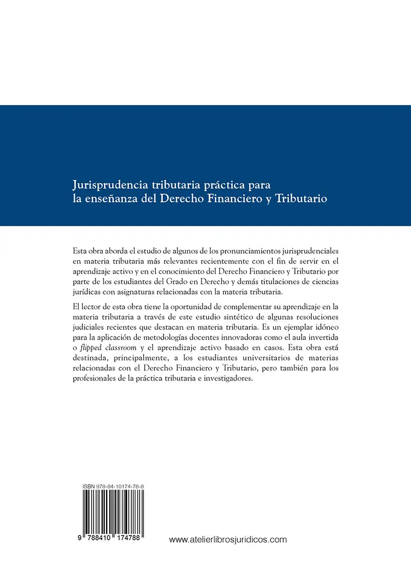 Esta obra aborda el estudio de algunos de los pronunciamientos jurisprudenciales en materia tributaria más relevantes recientemente con el fin de servir en el aprendizaje activo y en el conocimiento del Derecho Financiero y Tributario por parte de los estudiantes del Grado en Derecho y demás titulaciones de ciencias jurídicas con asignaturas relacionadas con la materia tributaria.El lector de esta obra tiene la oportunidad de complementar su aprendizaje en la materia tributaria a través de este estudio sintético de algunas resoluciones judiciales recientes que destacan en materia tributaria. Es un ejemplar idóneo para la aplicación de metodologías docentes innovadoras como el aula invertida o flipped classroom y el aprendizaje activo basado en casos. Esta obra está destinada, principalmente, a los estudiantes universitarios de materias relacionadas con el Derecho Financiero y Tributario, pero también para los profesionales de la práctica tributaria e investigadores.