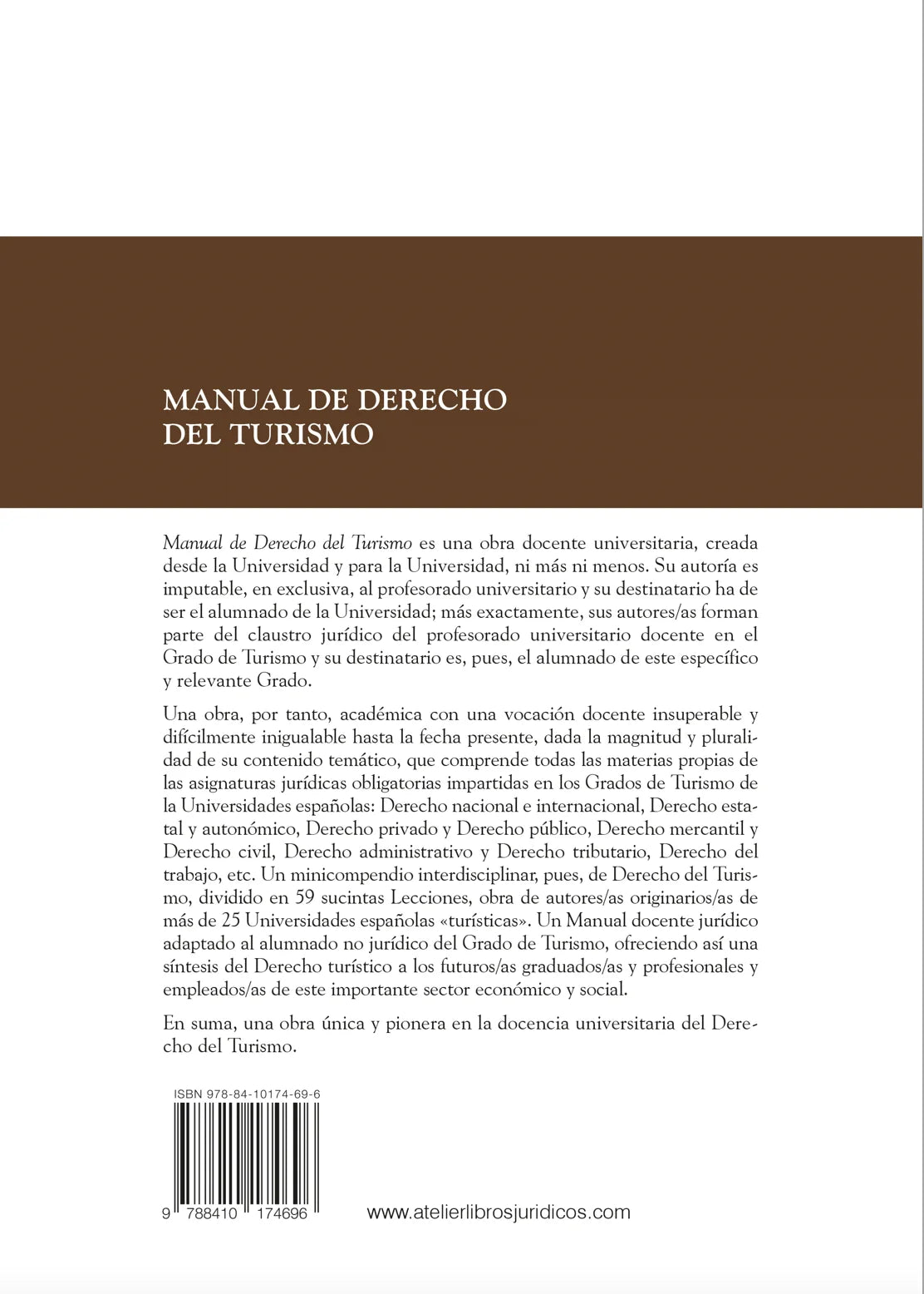 Manual de Derecho del Turismo es una obra docente universitaria, creada desde la Universidad y para la Universidad, ni más ni menos. Su autoría es imputable, en exclusiva, al profesorado universitario y su destinatario ha de ser el alumnado de la Universidad; más exactamente, sus autores/as forman parte del claustro jurídico del profesorado universitario docente en el Grado de Turismo y su destinatario es, pues, el alumnado de este específico y relevante Grado.