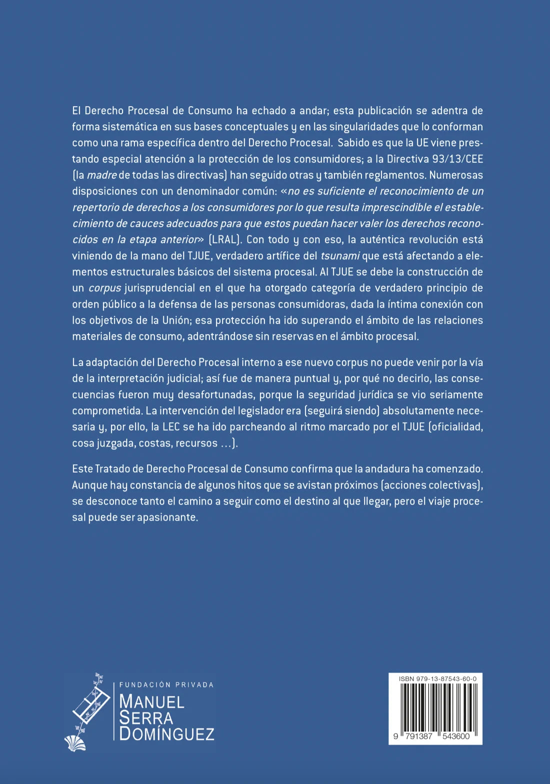 El Tratado de Derecho Procesal de Consumo constata el inicio firme de una nueva y específica rama del Derecho Procesal, moldeada por las exigencias de protección al consumidor en el marco europeo. Con un enfoque sistemático, esta obra analiza los fundamentos conceptuales y las singularidades que definen este emergente campo, en el que confluyen la normativa de la Unión Europea —desde la emblemática Directiva 93/13/CEE hasta los recientes reglamentos— y, sobre todo, la intensa actividad del Tribunal de Justicia de la Unión Europea, verdadero motor de transformación estructural del sistema procesal.