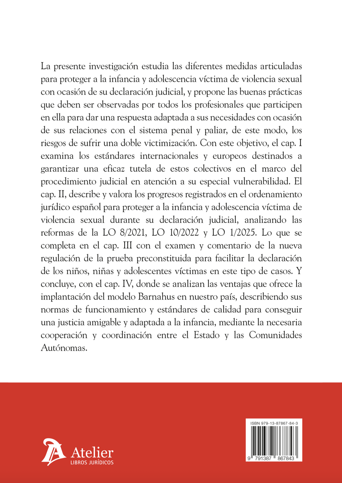 García Rodríguez, Manuel José. Buenas prácticas para proteger a la infancia y adolescencia víctima de violencia sexual en su declaración judicial. Barcelona, España: Atelier, 2025. Accessed October 23, 2025. https://atelieropenaccess.com/products/buenas-practicas-para-proteger-a-la-infancia-y-adolescencia-victima-de-violencia-sexual-en-su-declaracion-judicial.