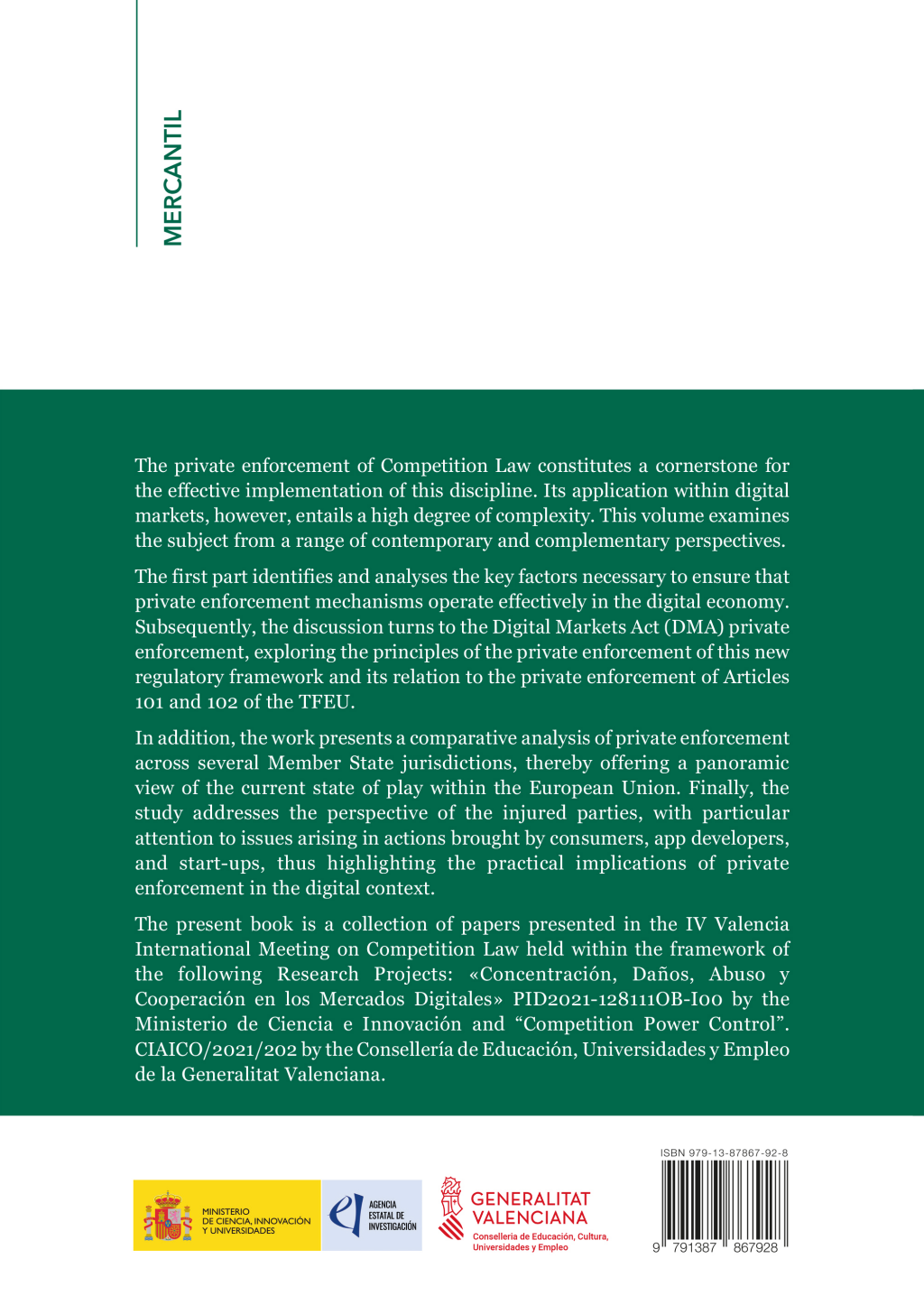 The private enforcement of Competition Law constitutes a cornerstone for the effective implementation of this discipline. Its application within digital markets, however, entails a high degree of complexity. This volume examines the subject from a range of contemporary and complementary perspectives. The first part identifies and analyses the key factors necessary to ensure that private enforcement mechanisms operate effectively in the digital economy. Subsequently, the discussion turns to the Digital Markets Act (DMA) private enforcement, exploring the principles of the private enforcement of this new regulatory framework and its relation to the private enforcement of Articles 101 and 102 of the TFEU. In addition, the work presents a comparative analysis of private enforcement across several Member State jurisdictions, thereby offering a panoramic view of the current state of play within the European Union. Finally, the study addresses the perspective of the injured parties, with particular attention to issues arising in actions brought by consumers, app developers, and start-ups, thus highlighting the practical implications of private enforcement in the digital context.