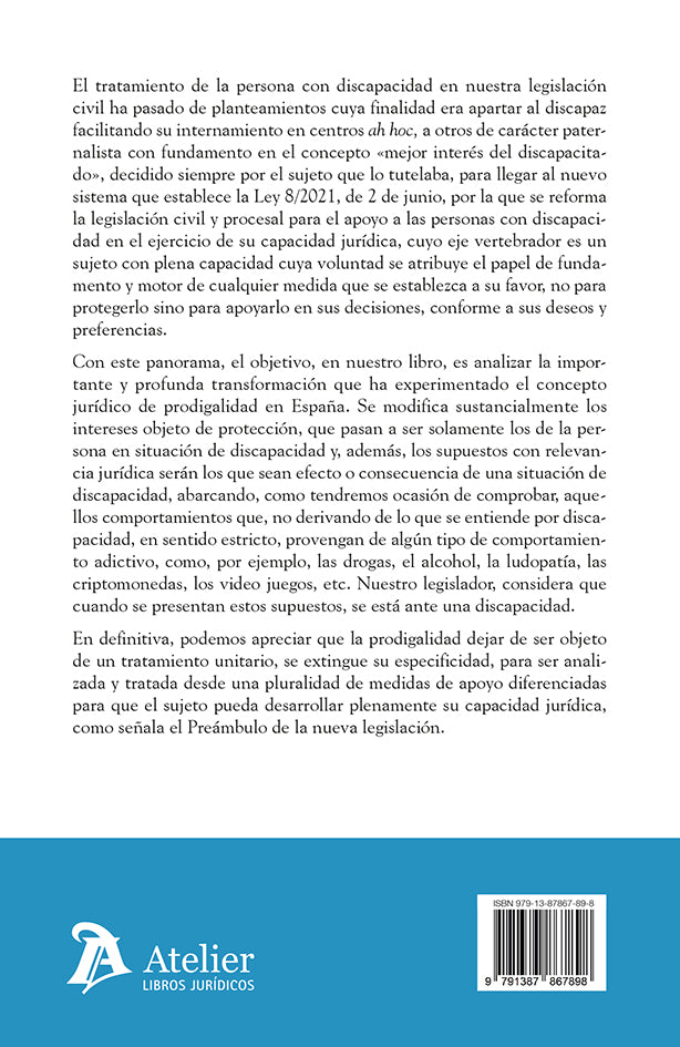 Con este panorama, el objetivo, en nuestro libro, es analizar la importante y profunda transformación que ha experimentado el concepto jurídico de prodigalidad en España. Se modifica sustancialmente los intereses objeto de protección, que pasan a ser solamente los de la persona en situación de discapacidad y, además, los supuestos con relevancia jurídica serán los que sean efecto o consecuencia de una situación de discapacidad, abarcando, como tendremos ocasión de comprobar, aquellos comportamientos que, no derivando de lo que se entiende por discapacidad, en sentido estricto, provengan de algún tipo de comportamiento adictivo, como, por ejemplo, las drogas, el alcohol, la ludopatía, las criptomonedas, los video juegos, etc. Nuestro legislador, considera que cuando se presentan estos supuestos, se está ante una discapacidad.