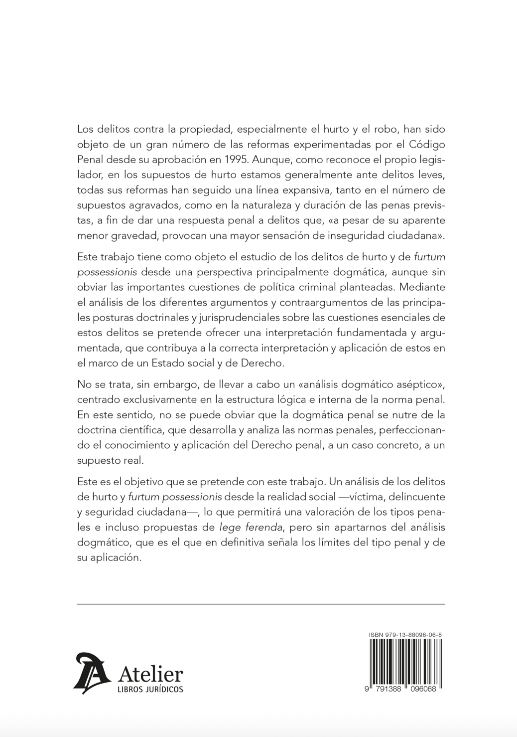 Este trabajo tiene como objeto el estudio de los delitos de hurto y de furtum possessionis desde una perspectiva principalmente dogmática, aunque sin obviar las importantes cuestiones de política criminal planteadas. Mediante el análisis de los diferentes argumentos y contraargumentos de las principales posturas doctrinales y jurisprudenciales sobre las cuestiones esenciales de estos delitos, se pretende ofrecer una interpretación fundamentada y argumentada que contribuya a la correcta interpretación y aplicación de estos en el marco de un Estado social y de Derecho.
