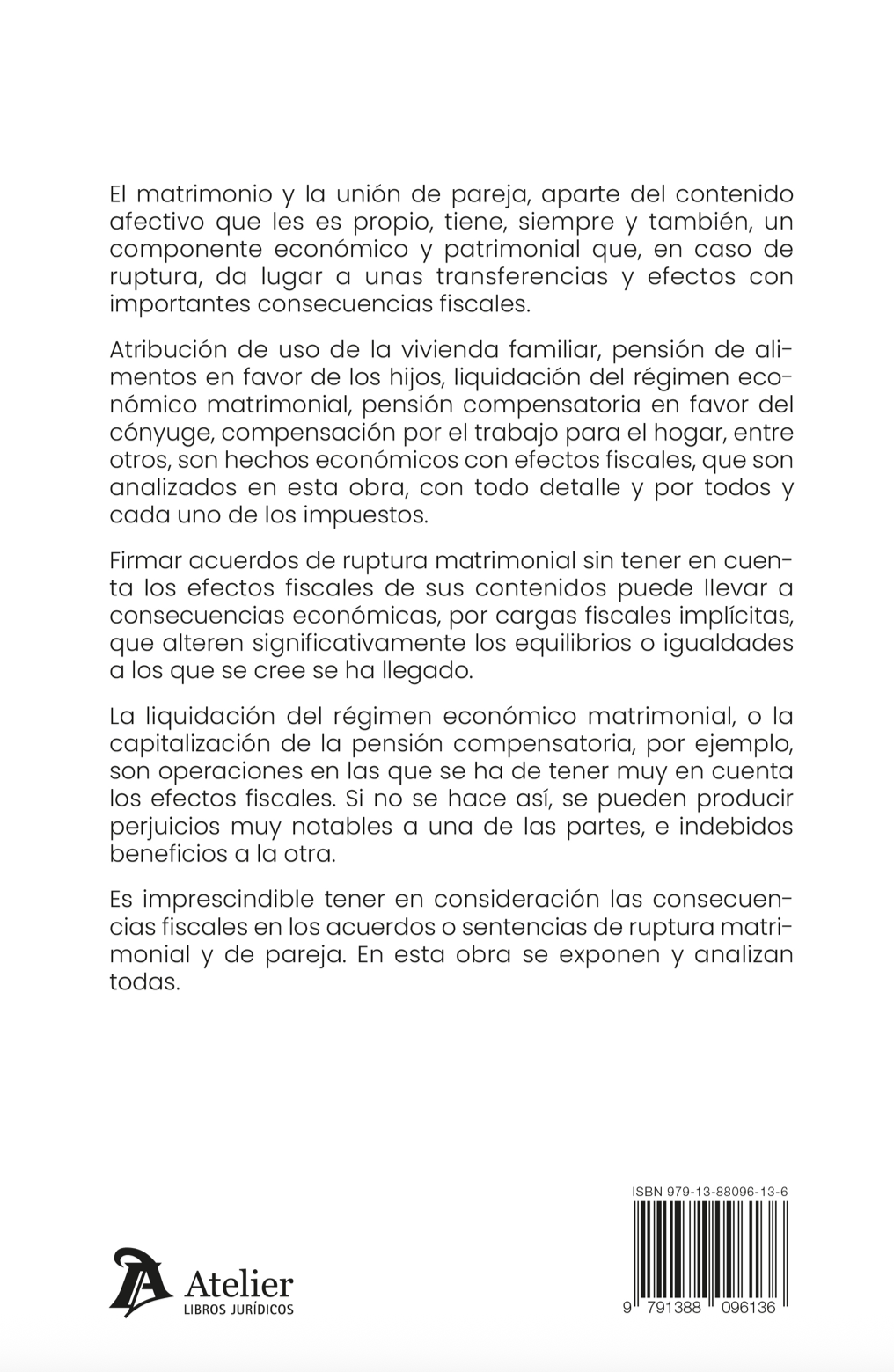 Este libro ofrece un análisis minucioso de cada uno de estos supuestos, abordando su tratamiento en los distintos impuestos y poniendo de relieve los riesgos que puede acarrear una planificación fiscal deficiente en los acuerdos de separación. Comprender cómo tributan estas operaciones resulta esencial para evitar desequilibrios económicos derivados de cargas fiscales no previstas. El objetivo de la obra es dotar a los profesionales y a las personas afectadas de una herramienta clara y útil para gestionar con rigor y justicia los efectos fiscales de la disolución de la vida en común.