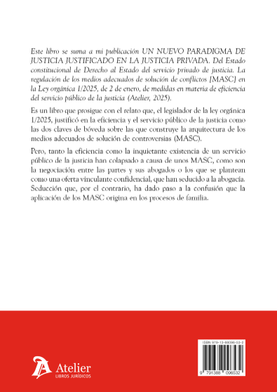 Este libro se suma a mi publicación Un nuevo paradigma de justicia justificado en la justicia privada. Del Estado constitucional de Derecho al Estado del servicio privado de justicia. La regulación de los medios adecuados de solución de conflictos (MASC) en la Ley orgánica 1/2025, de 2 de enero, de medidas en materia de eficiencia del servicio público de la justicia (Atelier, 2025).