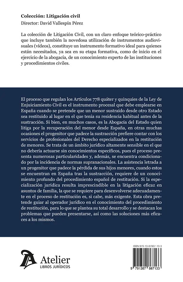 Esta obra ofrece al operador jurídico una guía práctica, detallada y actualizada del procedimiento de restitución de menores en España, analizando su desarrollo completo y los principales problemas que pueden surgir en su tramitación. Con un enfoque práctico y orientado a la eficacia, se proponen soluciones útiles y estrategias procesales adaptadas a los distintos escenarios posibles. Un manual imprescindible para quienes intervienen en uno de los procedimientos más complejos y delicados del Derecho de familia internacional.