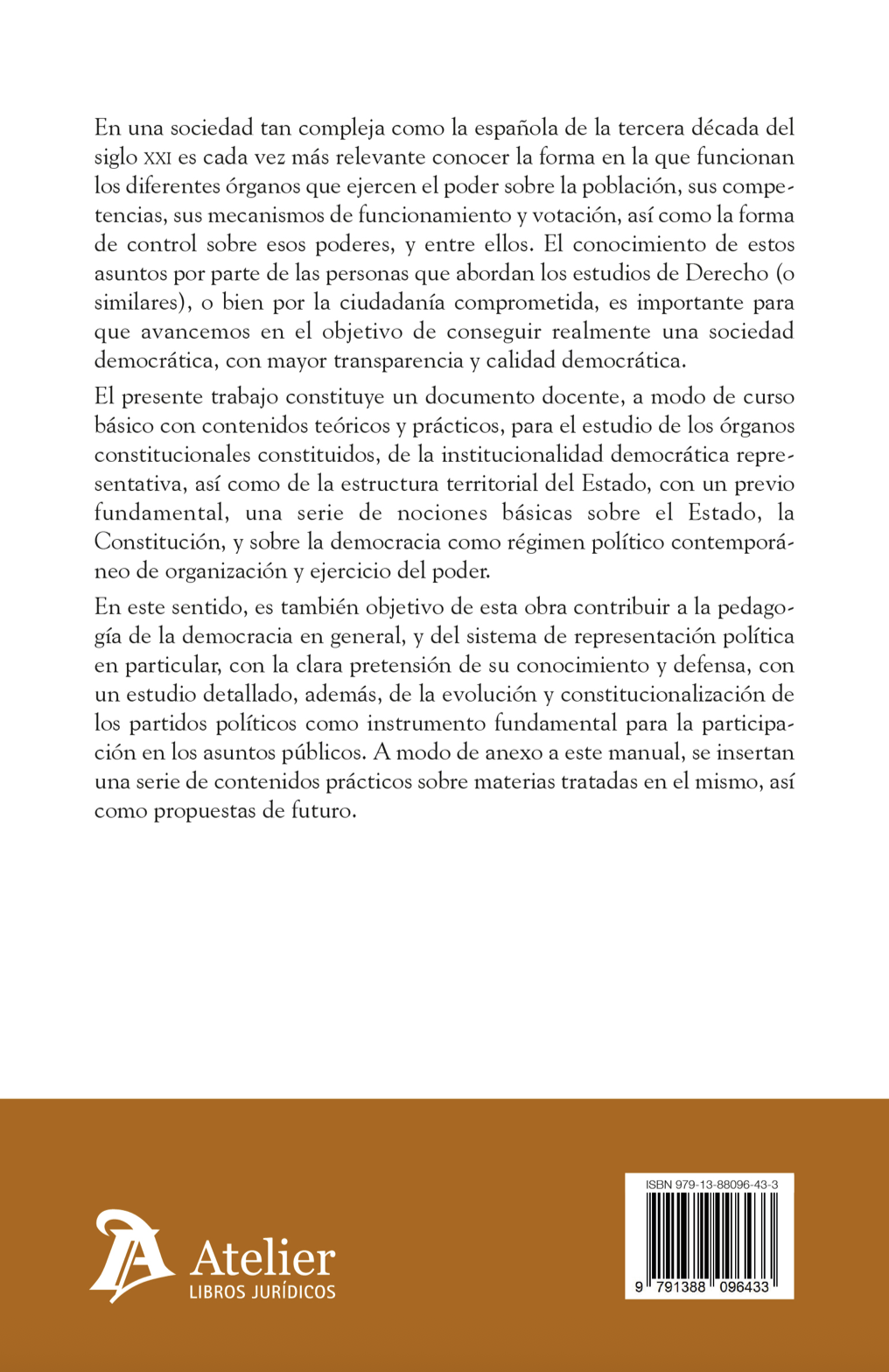 La presente obra, concebida como material docente, ofrece un curso básico que combina contenidos teóricos y prácticos sobre los órganos constitucionales del Estado, el sistema de representación política y la estructura territorial. Se parte de una introducción conceptual sobre el Estado, la Constitución y la democracia como forma contemporánea de organización del poder, sentando las bases para un análisis riguroso del entramado institucional.