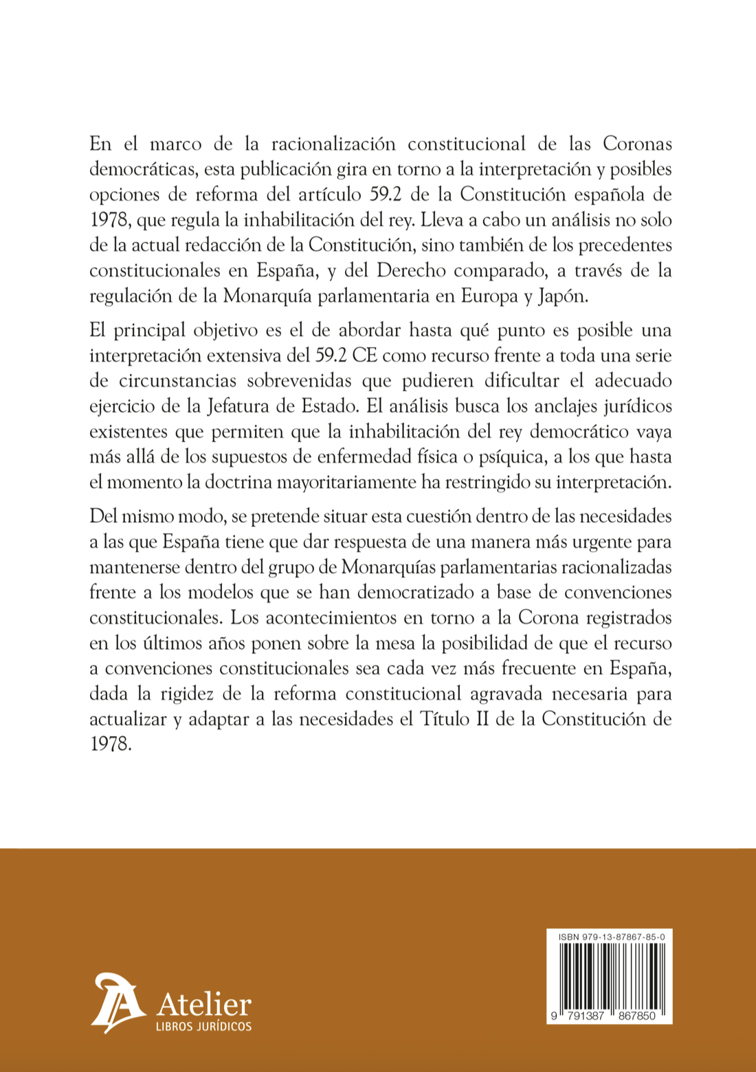 Esta obra ofrece un análisis jurídico y comparado del artículo 59.2 de la Constitución española, centrado en su interpretación y en las posibles opciones de reforma vinculadas a la inhabilitación del rey. Partiendo de un estudio de los precedentes constitucionales españoles y del Derecho comparado —con especial atención a otras Monarquías parlamentarias europeas y al modelo japonés—, se plantea hasta qué punto este precepto puede ser interpretado de forma extensiva para afrontar situaciones que, sin ser estrictamente médicas, comprometan el adecuado ejercicio de la Jefatura del Estado.