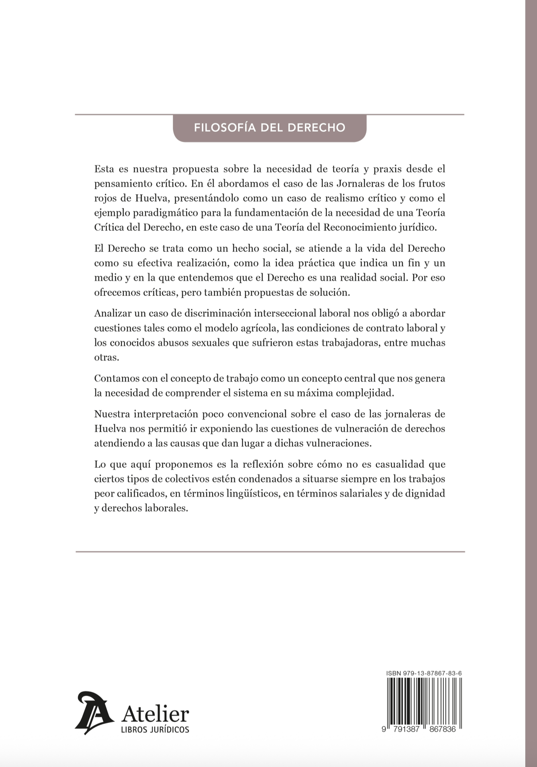 Este estudio plantea una lectura crítica y comprometida del Derecho desde el prisma del realismo crítico, tomando como eje el caso paradigmático de las Jornaleras de los frutos rojos de Huelva. Lejos de una aproximación convencional, se analiza la discriminación interseccional laboral que afecta a estas trabajadoras, abordando factores estructurales como el modelo agrícola, las condiciones contractuales o los abusos sistemáticos sufridos por parte del colectivo. A partir de este enfoque, el trabajo se sitúa en la intersección entre teoría jurídica y praxis social, apostando por una Teoría del Reconocimiento jurídico que atienda no solo al Derecho como norma, sino como realidad social en la que se proyectan desigualdades, exclusiones y vulneraciones de derechos.