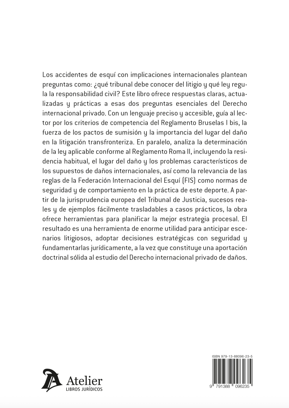 Además de ofrecer un análisis normativo completo, el libro incorpora ejemplos prácticos, casos reales y referencias a la jurisprudencia del TJUE, lo que permite al lector aplicar los conceptos a situaciones concretas con seguridad. Se presta especial atención a las reglas técnicas y de conducta establecidas por la Federación Internacional de Esquí (FIS), evaluando su valor jurídico como estándares de diligencia en contextos de responsabilidad civil. Dirigida a juristas, aseguradoras y operadores jurídicos en general, la obra constituye una guía práctica para litigar con eficacia y una contribución relevante al estudio de los daños internacionales en el ámbito deportivo.