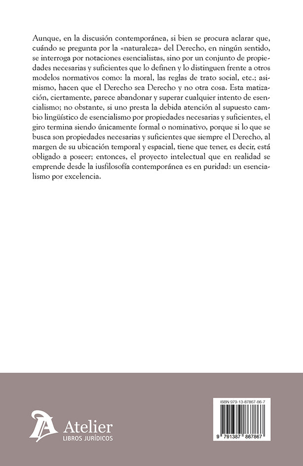 El análisis pone de manifiesto que, en la práctica, la búsqueda de rasgos universales que el Derecho debe poseer en cualquier contexto histórico y geográfico equivale, precisamente, a retomar una postura esencialista con otro nombre. Así, la obra desvela que gran parte del discurso iusfilosófico contemporáneo —pese a su aparente distanciamiento— continúa anclado en una lógica fundacional que pretende fijar la identidad del Derecho con criterios invariantes, reeditando el mismo proyecto teórico que dice haber dejado atrás.