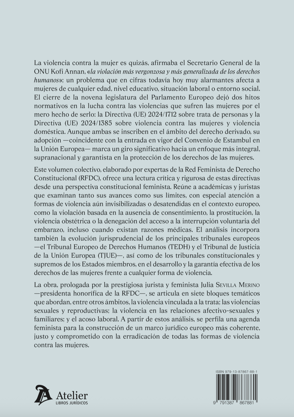 Este volumen colectivo, elaborado por expertas de la Red Feminista de Derecho Constitucional (RFDC), ofrece una lectura crítica y rigurosa de estas directivas desde una perspectiva constitucional feminista. Reúne a académicas y juristas que examinan tanto sus avances como sus límites, con especial atención a formas de violencia aún invisibilizadas o desatendidas en el contexto europeo, como la violación basada en la ausencia de consentimiento, la prostitución, la violencia obstétrica o la denegación del acceso a la interrupción voluntaria del embarazo, incluso cuando existan razones médicas. El análisis incorpora también la evolución jurisprudencial de los principales tribunales europeos —el Tribunal Europeo de Derechos Humanos (TEDH) y el Tribunal de Justicia de la Unión Europea (TJUE)—, así como de los tribunales constitucionales y supremos de los Estados miembros, en el desarrollo y la garantía efectiva de los derechos de las mujeres frente a cualquier forma de violencia.